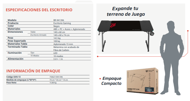 Escritorio Gamer Ergonómico Olympus Spot Glow MRX6000 Balam Rush Legend Series Escritorio Gamer Ergonómico 140 x 60cm, Iluminación RGB, Almohadilla XXL Antideslizante, 80cm, Porta Vasos, Gancho para Auriculares, Soporta hasta 100 Kg Melamina con Acabado de Fibra de Carbón, Estructura Z Color Negro. BR-941396