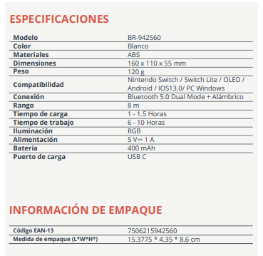 Gamepad control Inalámbrico BALAMRUSH POCKET G555 Blanco. Conexión Bluetooth 5.0 Dual Mode + Alámbrico, Compatibilidad Con Nintendo Switch, Android, iOS y PC Windows, Dimensiones 160 x 110 x 55 mm, peso 120g, Rango de 8 mts, Iluminación RGB. Puerto de carga USB-C. Medida de empaque (L*W*H*) 15.3775 * 4.35 * 8.6 cm. Color Blanco. BR-942560