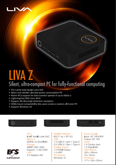 MINI PC ECS LIVA Z N3350 4G/64G, Intel Celeron Apollo Lake N3350, RAM LPDDR4 de 4 GB, Unidad de almacenamiento Flash DE 64GB. Gráficos: Intel® HD Graphics; Puertos: USB 3.0, USB 2.0; Conectividad: 1 LAN, Wi-Fi estándares: 802.11b, 802.11g, 802.11n, Versión de Bluetooth: 4.0: "1 x HDMI Output, 1 x mDP Output, 1 x Combo Jack, 3 x USB 3.0 (Type A), 1 x USB 3.0 (Type C).