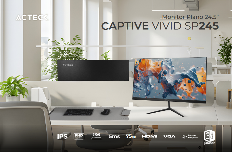 Monitor Plano 24.5" CAPTIVE VIVD SP245, Monitor plano 24.5", FULL HD 1920x1080 PX, 75 HZ, Tiempo de respuesta 5ms, Material Metal y Plástico. Tipo de panel IPS, Dimensiones 55.9 x 32.9 x 41.2 cm, VESA 75x75. Kensington Lock si. Ajuste de inclinación Frontal 5° / Trasero 15°. Medida de empaque (L*W*H) 61.3 * 10 * 38.8 cm, Peso 3.3kg. AC-943178