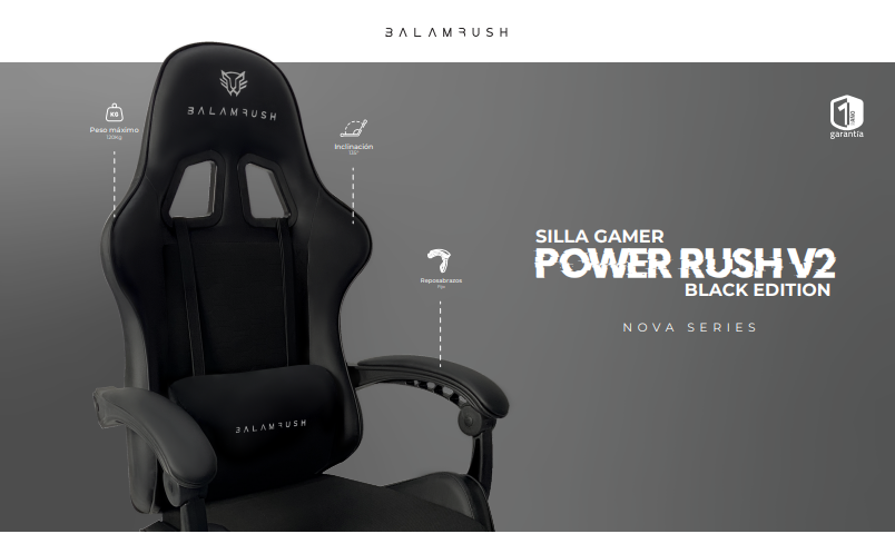 Silla Power Rush V2 Balam Rush NOVA SERIES Reposabrazos 1D, Pistón de gas clase 3, Soporta hasta 120 kg, Materiales: Metal, espuma, tela, nylon, poliuretano, Garantia 2 años. Color Negro BR-934534