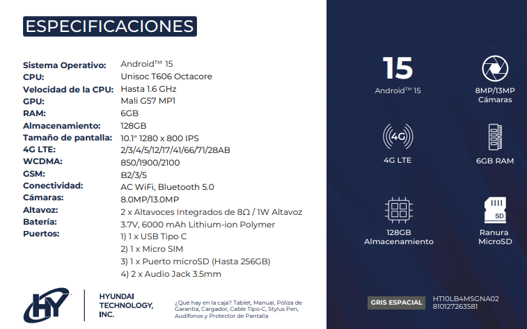 Tableta HYUNDAI 10LB4 6GB RAM, Almacenamiento: 128GB, 10,1 pulgadas,Sistema Operativo: Android 15. Velocidad de la CPU: Hasta 1.6 GHz, GPU: Mali G57 MP1, Tamaño de pantalla: 10.1" 1280 x 800 IPS. 4G LTE: 2/3/4/5/12/17/41/66/71/28AB, WCDMA: 850/1900/2100, GSM: B2/3/5, Conectividad: AC WiFi, Bluetooth 5.0,Batería:3.7V, 6000 mAh Lithium-ion Polymer. Cámaras: 8.0MP/13.0MP, Puertos: 1) 1 x USB Tipo C, 2) 1 x Micro SIM, 3) 1 x Puerto microSD (Hasta 256GB), 4) 2 x Audio Jack 3.5mm